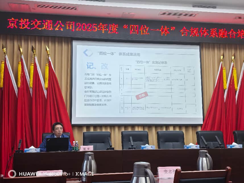 2025年11月21日,我司副总经理鲍良受北京京投交通发展有限公司委托,成功组织开展“四位一体”合规管理体系融合成果培训。本次培训聚焦内控、风险、合规与法律事务管理体系的一体化建设与落地实践,旨在助力企业提升综合治理效能与合规经营水准。
