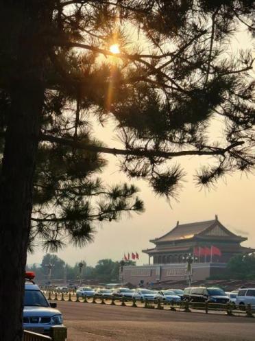 也曾在忙完审计工作后走进天安门广场,夕阳透过松枝洒下金辉,给庄严的城楼镀上温暖光晕。城楼前红旗猎猎,“中华人民共和国万岁”“世界人民大团结万岁” 的标语格外醒目,路上车辆有序往来,远处草木郁郁葱葱。这一刻,所有忙碌都被这肃穆又温柔的景象抚平,心中满是对祖国的自豪,也格外珍惜这片刻宁静。