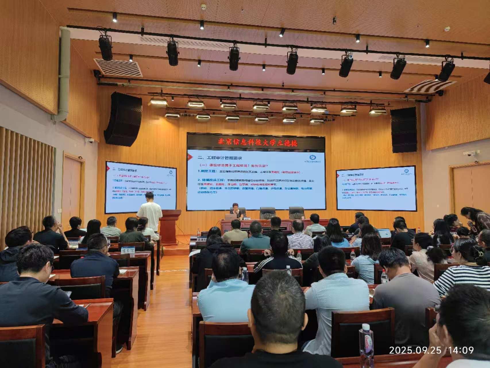 2025年9月25日下午,信息大学在沙河校区召开建设工程管理风险识别与防范专题培训会,审计处郑彩云、中京华(北京)工程咨询有限公司李飞、北京中天恒达工程咨询有限公司曲惠华分别就学校工程审计制度、建设项目合规管理及招投标领域风险防范、修缮改造工程审计流程等相关专题作了培训,会议由审计处处长许波主持。