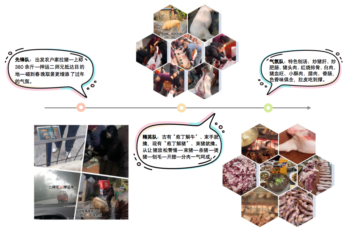 刨猪宴,又称刨汤宴、杀猪饭,是中国西南地区农耕文明孕育的传统民俗。“刨猪宴”的“刨”字,源自杀猪时的关键工序—用约70摄氏度的开水烫猪身,再以铁皮刨刀刮去猪毛;“汤”则是用刚宰杀的猪血、内脏、鲜骨等快速熬制的热汤。论吃到刨猪宴需要几步,传统流程是杀猪—烫猪—刨毛—开膛—分肉—做刨汤—开宴,本次刨猪宴由先锋队 拉猪——精英队 按猪、杀猪——气氛队 坐享刨猪宴。(刨猪宴偶遇央视春晚竹海拍摄取景,热热闹闹更加有过年的气氛!)