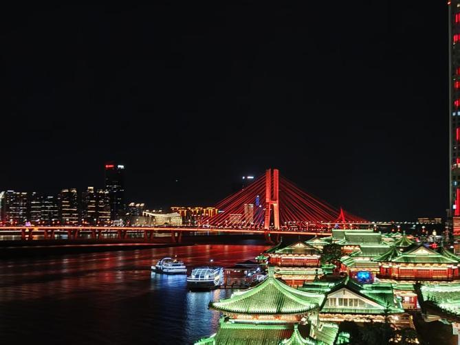 七月的南昌暑气未消,忙完项目后我踏入滕王阁。夜色中的楼阁被灯光勾勒得愈发典雅,飞檐翘角在夜空下舒展身姿,凭栏远眺,赣江水面游船驶过,灯光碎成满河星子。晚风裹着水汽拂面而来,瞬间驱散了工作的疲惫。
